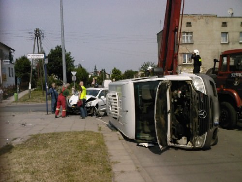 Zgłoszenie o wypadku wpłynęło do PSK w Starogardzie ok godz. 9:40. Na miejsce zdarzenia zadysponowano 3 zastępy straży pozarnej. Po przybyciu na miejsce ratownicy zastali 2 pojazdy po wypadku. Mercedes Sprinter leżał przewrócony na prawy bok a peugeot wbił się w słup oświetleniowy. Teren został zabezpieczony, jednakże w wyniku uderzenia w słup uszkodzona została latania która wisiała na kablu jak na włosku w każdej chwili grożąc upadkiem.Zadysponowano SH-18 z OSP Starogard.