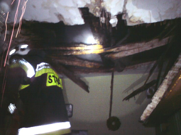 Ze względu na wciąż tlące się elementy łatwopalnego stropu (deski, trociny i trzcina) ratownicy przystąpili do prac rozbiórkowych. Za pomocą podręcznych narzędzi burzących zdemontowano całe pokrycie stropu w pomieszczeniu kuchennym, usunięto je na zewnątrz i dogaszono. Pozostałe pomieszczenia oddymiono i sprawdzono pod kątem zagrożenia pożarowego. Działania zakończono i zastępy wróciły do jednostek. Podano 2 prądy wody w natarciu. Zużycie wody - 0,5 m3. Pożar objął powierzchnię ok 5 m2 i objętość 3m3. Straty oszacowano na 20 tyś zł. Dzięki szybkiej reakcji mieszkańców budynku i sprawnej akcji strażaków zagrożenie nie rozprzestrzeniło się na dalszą część budynku. Czas pracy ratowników 2h i 28min.